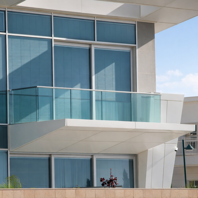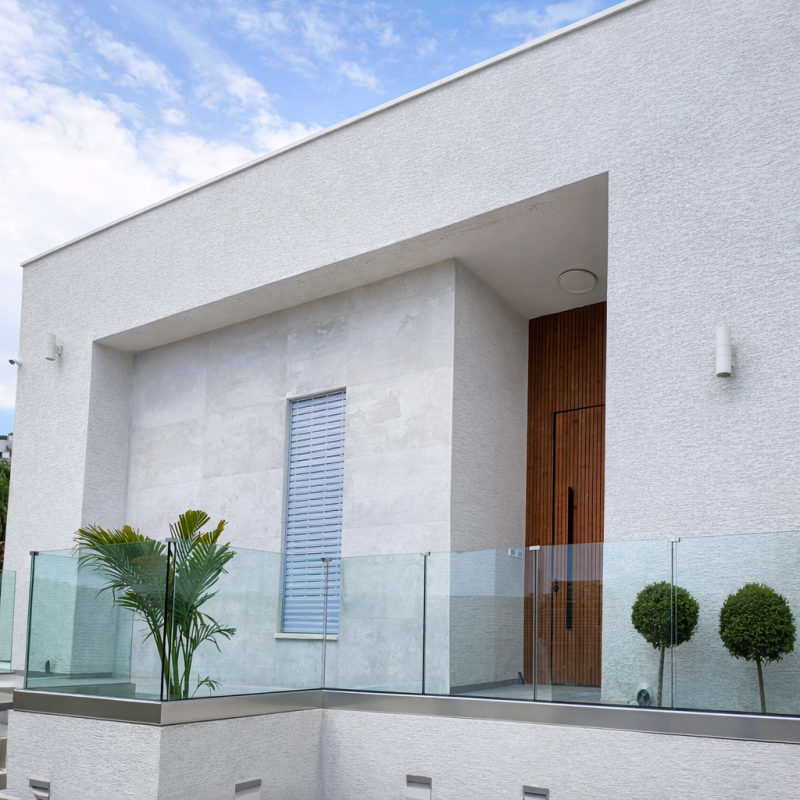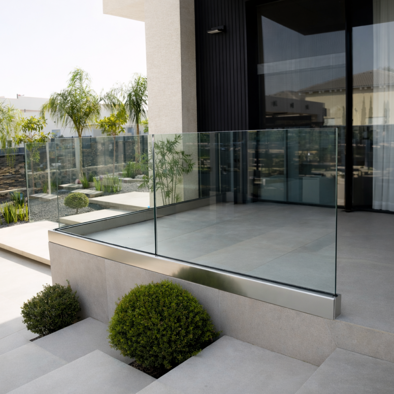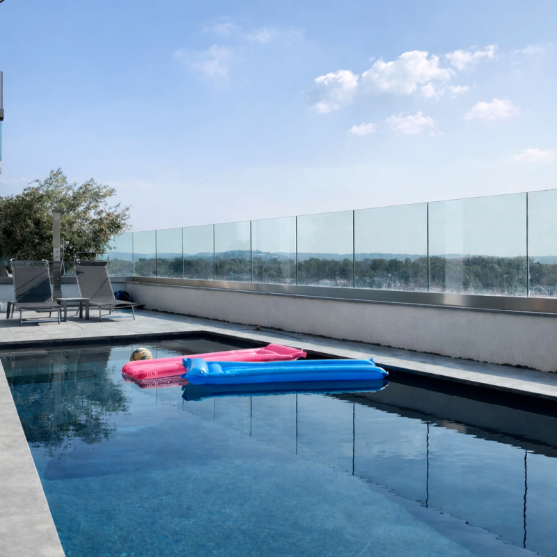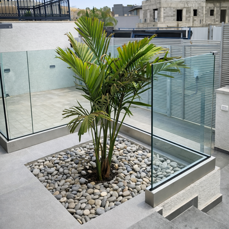 בחירה במעקה זכוכית מדגם חגי זכוכית שקועה מאפשר תחימה ברורה, יוקרתית ואלגנטית של המרפסת. המעקה עצמו שקוע בפאנל האלומיניום ומעניק מראה יציב וחזק מבלי לפגום בתחושת הקלילות שמלווה את מרחבי החוץ של הבית. החיבור בין הרצפה, האלומיניום והזכוכית יוצרים פרט איכותי במראה מודרני ונקי שקשה להתעלם ממנו ומשתלב באופן מיטבי עם העיצוב הקיים. בדגם זה ניתן לבחור את כותרת המעקה בהתאמה אישית.